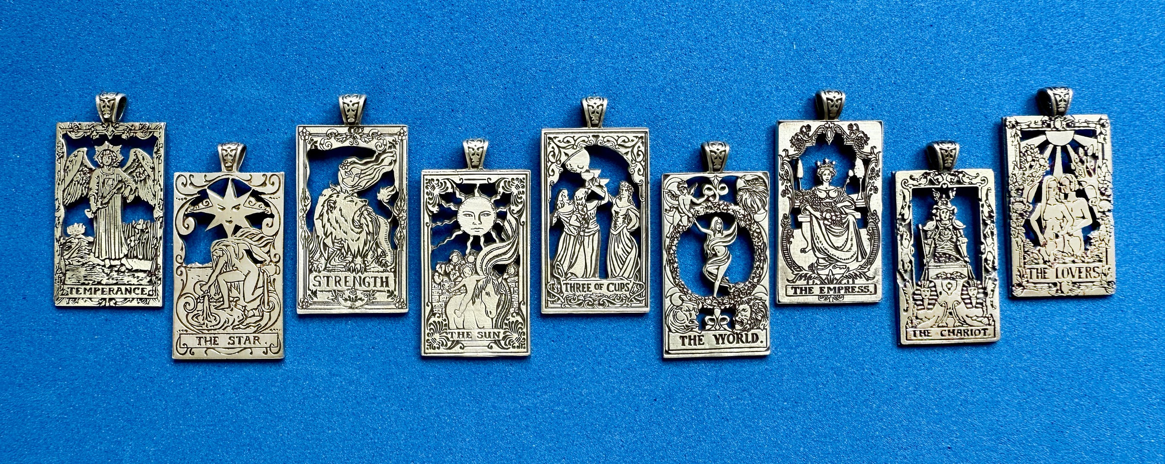 We are excited to offer our sterling silver Tarot card necklaces, carved by Sue Beatrice, now available directly on our site. These intricately detailed pendants have long been favorites of Tarot and art lovers.