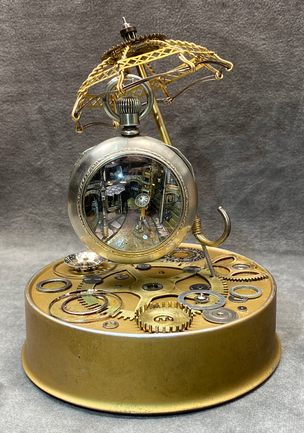 Step into a bygone era with "Rain," a one-of-a-kind sculpture by Sue Beatrice. Meticulously created from antique watch parts dating back to the mid-1800s, this detailed street scene captures the essence of a rainy day in an old European city, reminiscent of a charming Parisian cobblestone street.