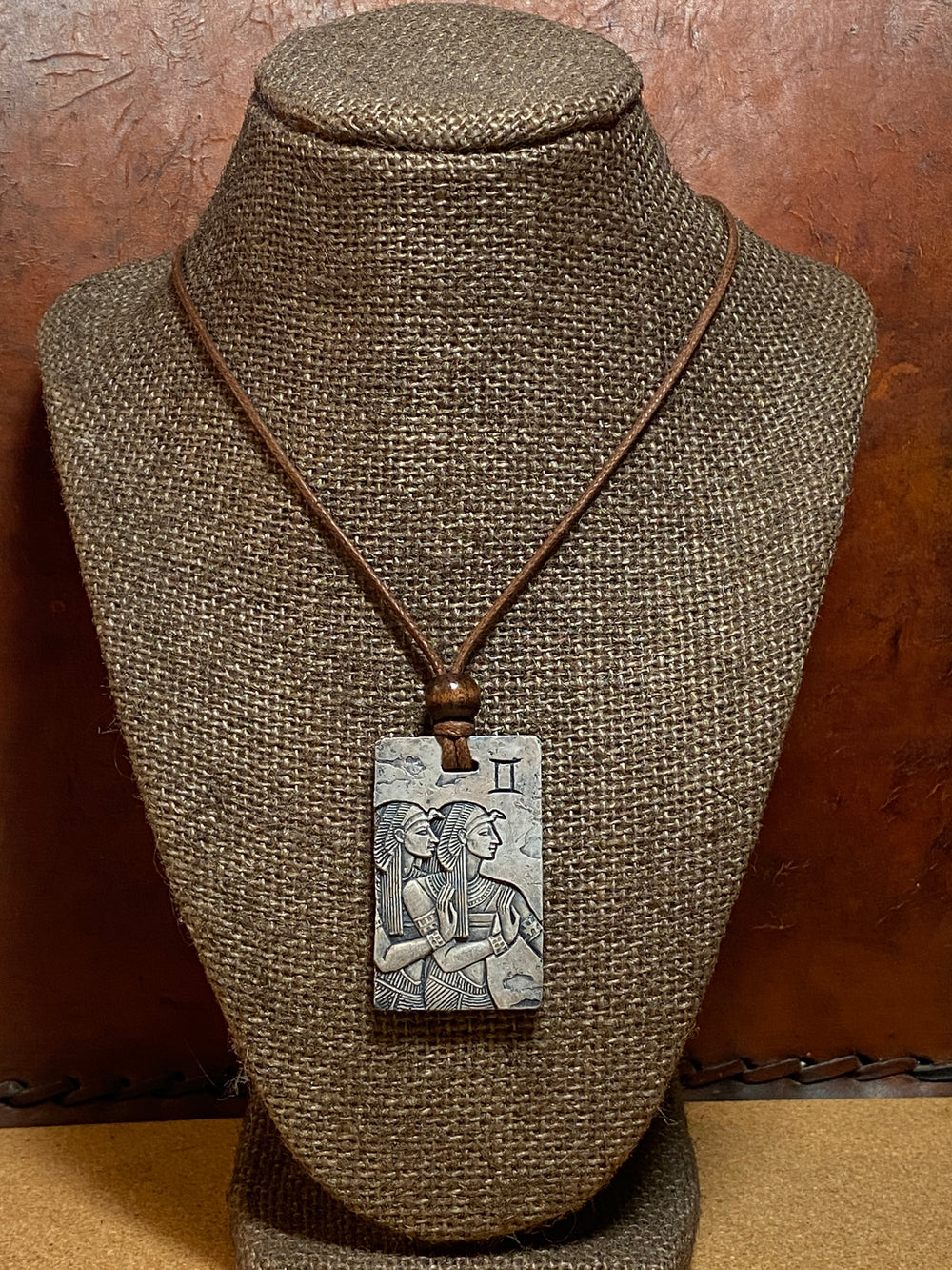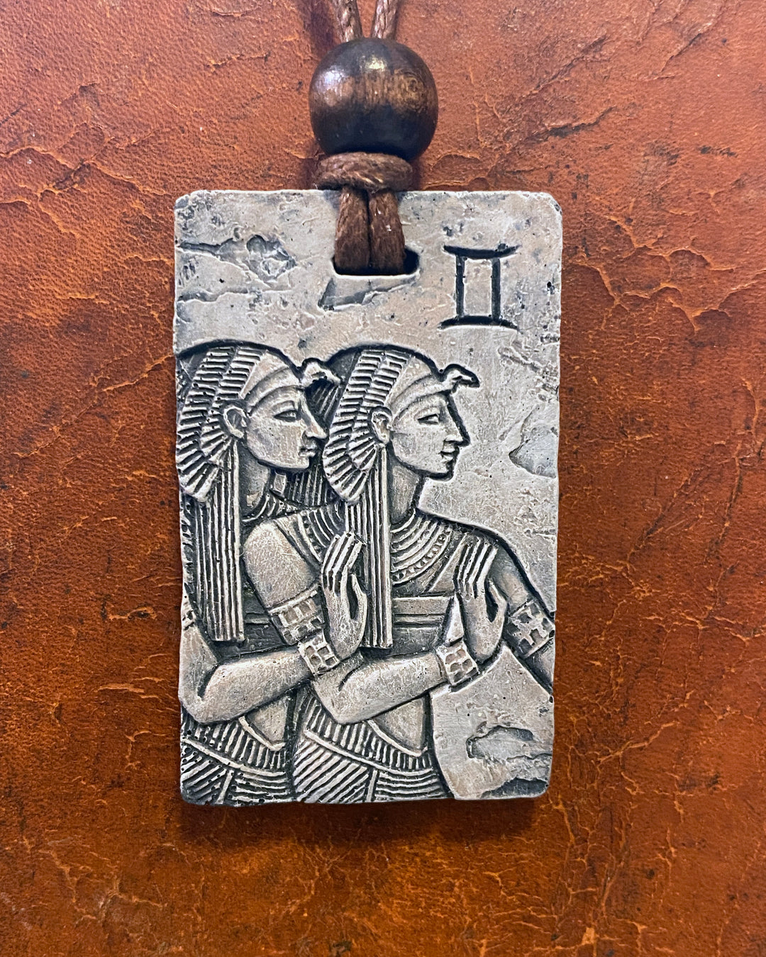 Hand-cast by Sue Beatrice in a durable, stone-like material, each pendant features designs inspired by ancient Sumerian and Egyptian art, making every piece truly one-of-a-kind.