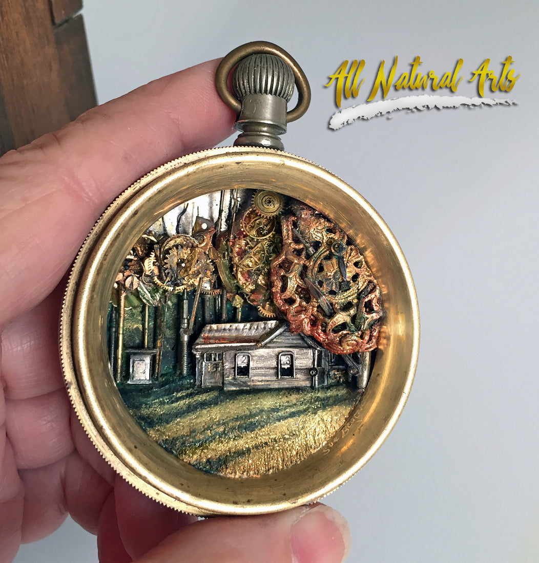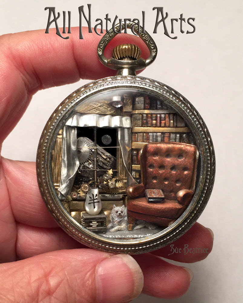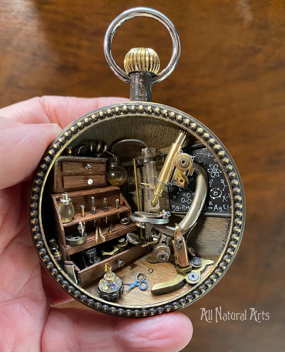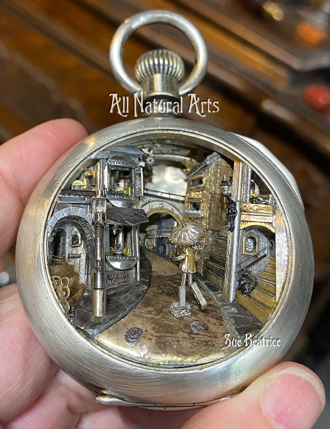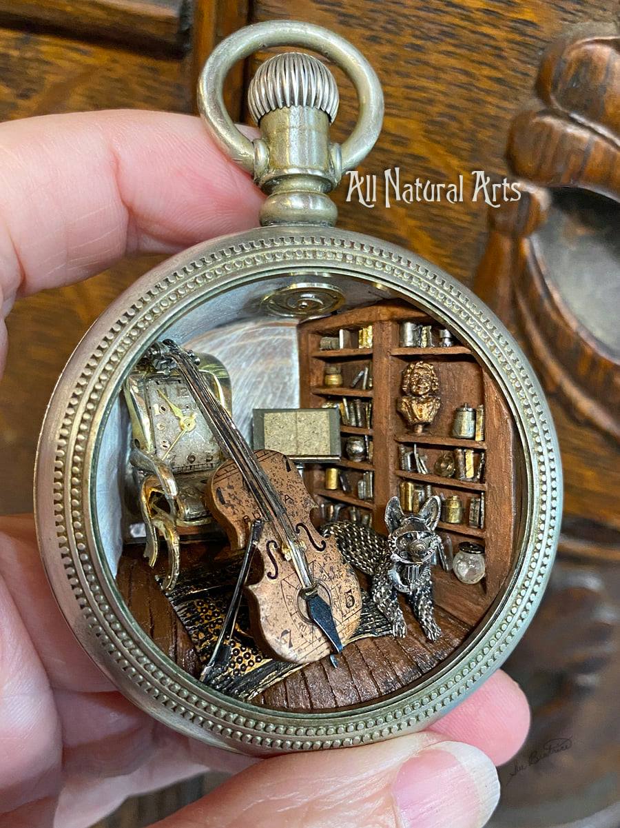 Sue transforms your idea into a unique world within an antique pocket watch case, creating a gift that deeply resonates.